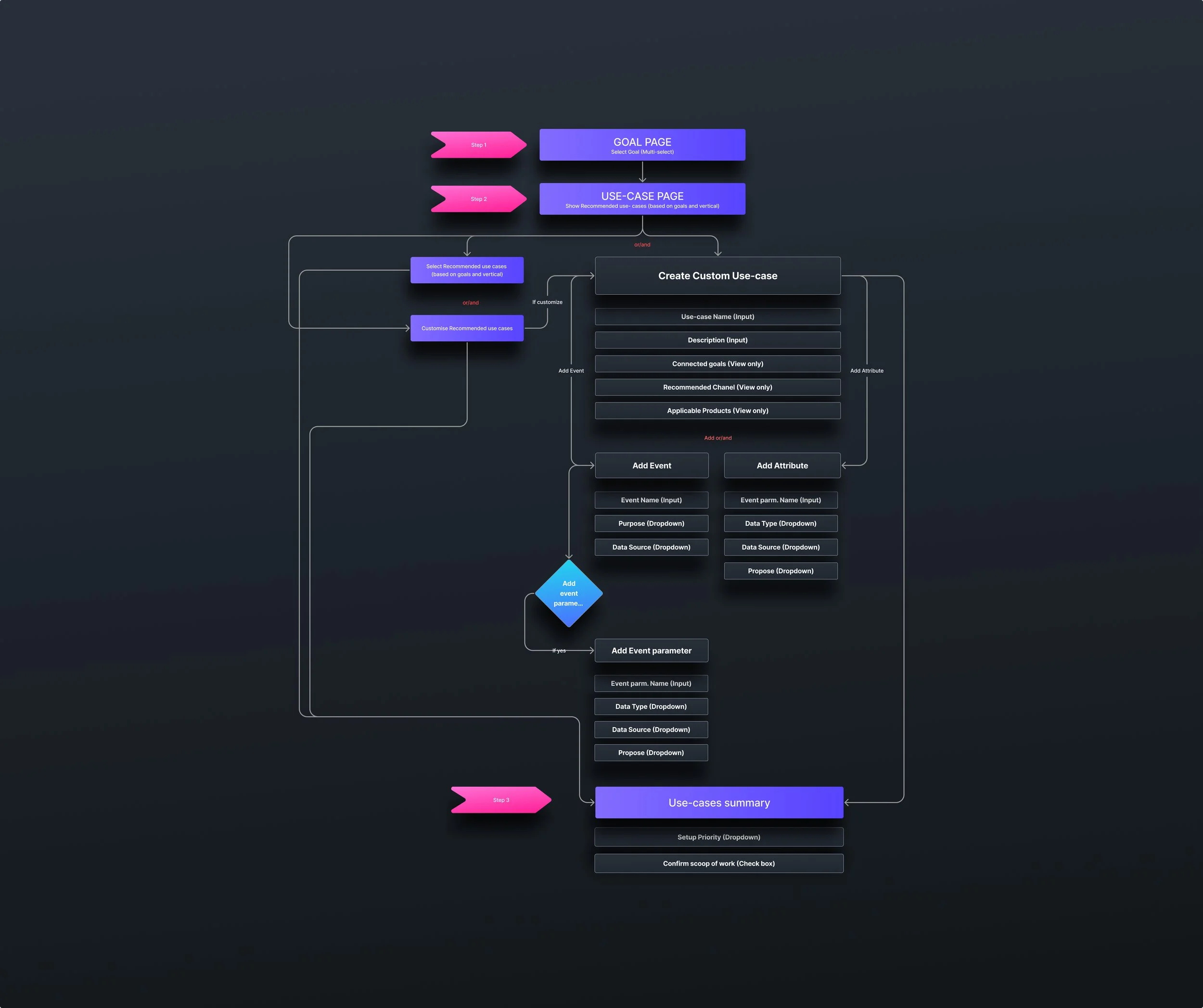 We transformed this process into a guided, goal-driven experience inside the product. Users now define business objectives, explore recommended use cases, and customize their data setup in one intuitive flow.